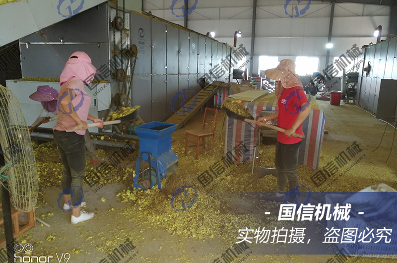 使用這種動態烘干的好處是:烘干非常的均勻。一般情況下,我們的大型網帶烘干機內部有4到6層循環網帶,也就是說,在烘干過程中,黃蜀葵會經過4至6次的循環翻轉,熱風自下而上穿透烘干時,可以讓黃蜀葵的每個部分都受到熱風的吹拂,使花朵的各部分水分散發均勻,成品干貨的品質統一。