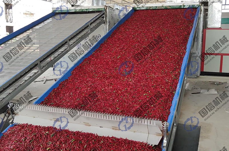 國信廠家生產(chǎn)的大型辣椒烘干機(jī)是一種箱式結(jié)構(gòu),材質(zhì)有烤漆、不銹鋼、彩鋼三種材質(zhì)可供選擇。內(nèi)部是由一層一層的不銹鋼網(wǎng)組成。辣椒經(jīng)過輸送帶進(jìn)入到烘干箱內(nèi)部,在內(nèi)部逐層的移動翻轉(zhuǎn),密集的網(wǎng)孔用來輸送辣椒的同時(shí)還能透氣,使熱源產(chǎn)生的熱氣在透過網(wǎng)孔穿過物料層的時(shí)候帶走辣椒內(nèi)部的水分。