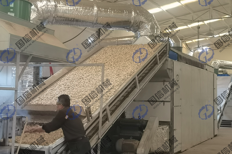 冷水漂洗:漂燙好的鱗片立刻投入氣泡清洗機的冷水中漂洗至冷,瀝干表面的水分。 熱風干燥:把瀝干表面水分的鱗片放入料斗內(nèi),經(jīng)自動鋪料裝置送入百合烘干機上上層進行干燥,溫度控制在60-70℃,在網(wǎng)帶的帶動下,百合鱗片從上層往下層移動。運行中,百合片受到翻料器的翻動,同時,百合鱗片有多次往下落的過程,使百合鱗片翻動更徹底。最后,干燥至百合鱗片含水量至10%左右(手摸鱗片發(fā)脆為度),干燥好的百合干片從百合烘干機底層的出料口排出。