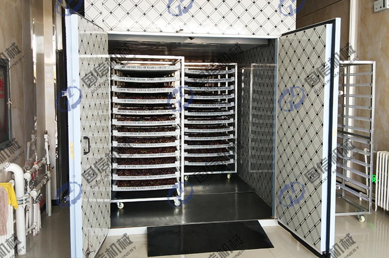 五、烘干的過(guò)程如下:將桃膠放入物料車托盤(pán),每盤(pán)15斤,每車12層,單臺(tái)車共180斤,6P主機(jī)帶5.8米長(zhǎng)3米寬2.2米高烘干房一次可以放入8臺(tái)物料車,共放入桃膠1500斤,烘干過(guò)程需要12-15小時(shí),溫度控制在55度,連續(xù)除濕即可完成。